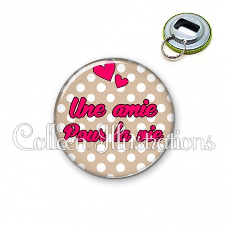 Image imprimée en haute résolution sur papier de qualité, protégée d'un film plastique, et sertie sur une coque métallique avec dos décapsuleur.