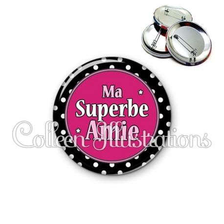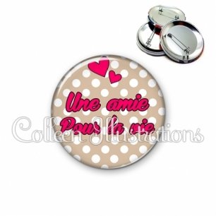 Image imprimée en haute résolution sur papier de qualité, protégée d'un film plastique, et sertie sur une coque et épingle métallique.