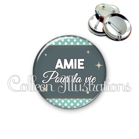 Image imprimée en haute résolution sur papier de qualité, protégée d'un film plastique, et sertie sur une coque et épingle métallique.