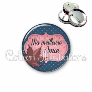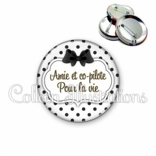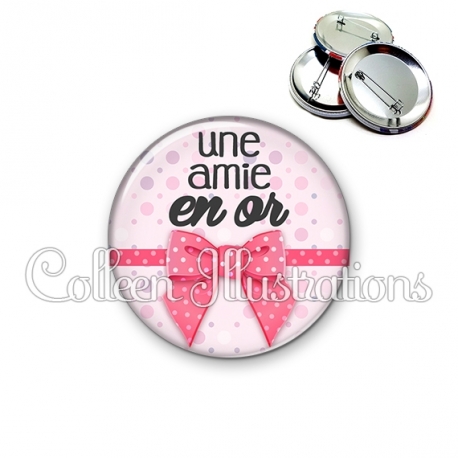Image imprimée en haute résolution sur papier de qualité, protégée d'un film plastique, et sertie sur une coque et épingle métallique.