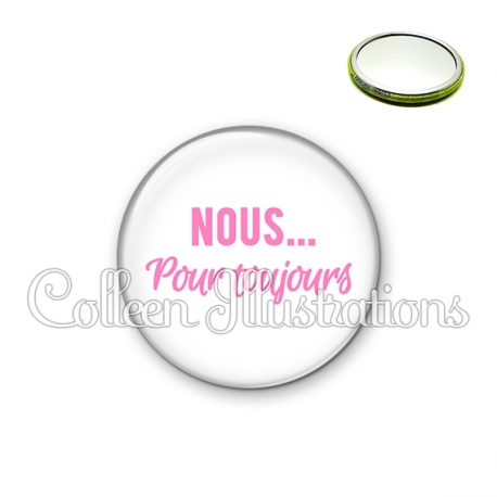Miroir simple avec dos métallique décoré d'une image fantaisie et texte.