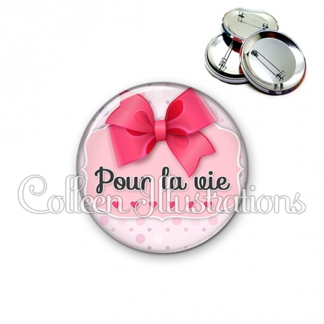 Image imprimée en haute résolution sur papier de qualité, protégée d'un film plastique, et sertie sur une coque et épingle métallique.