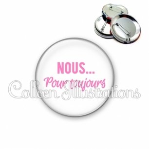 Image imprimée en haute résolution sur papier de qualité, protégée d'un film plastique, et sertie sur une coque et épingle métallique.