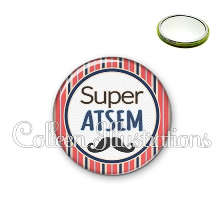 Image imprimée en haute résolution sur papier de qualité, protégée d'un film plastique, et sertie sur une coque métallique avec dos miroir. Une seule face, non grossissante.