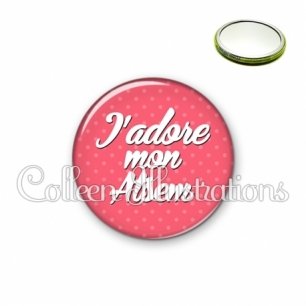 Image imprimée en haute résolution sur papier de qualité, protégée d'un film plastique, et sertie sur une coque métallique avec dos miroir. Une seule face, non grossissante.
