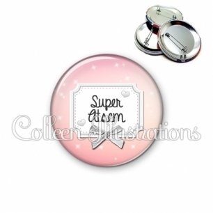 Image imprimée en haute résolution sur papier de qualité, protégée d'un film plastique, et sertie sur une coque et épingle métallique.
