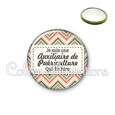 Image imprimée en haute résolution sur papier de qualité, protégée d'un film plastique, et sertie sur une coque métallique avec dos miroir. Une seule face, non grossissante.