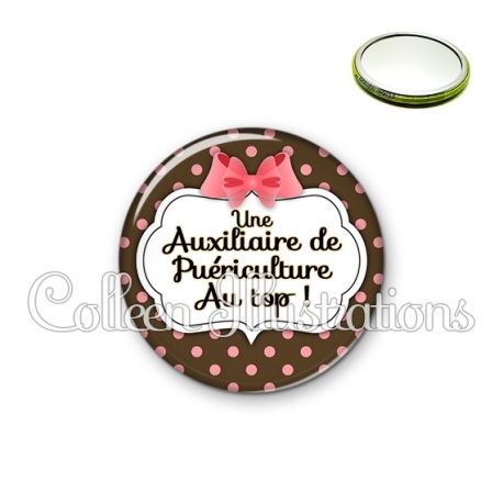 Image imprimée en haute résolution sur papier de qualité, protégée d'un film plastique, et sertie sur une coque métallique avec dos miroir. Une seule face, non grossissante.