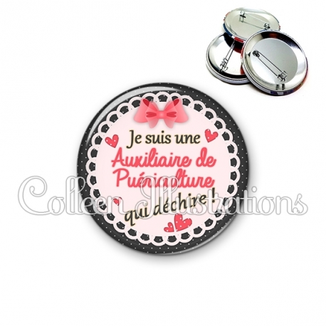 Image imprimée en haute résolution sur papier de qualité, protégée d'un film plastique, et sertie sur une coque et épingle métallique.