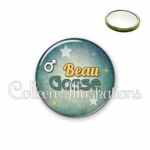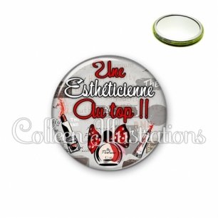 Image imprimée en haute résolution sur papier de qualité, protégée d'un film plastique, et sertie sur une coque métallique avec dos miroir. Une seule face, non grossissante.