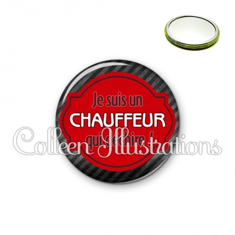 Image imprimée en haute résolution sur papier de qualité, protégée d'un film plastique, et sertie sur une coque métallique avec dos miroir. Une seule face, non grossissante.