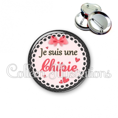 Image imprimée en haute résolution sur papier de qualité, protégée d'un film plastique, et sertie sur une coque et épingle métallique.