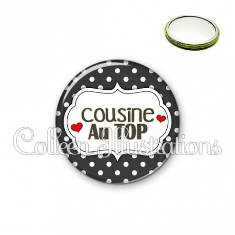 Image imprimée en haute résolution sur papier de qualité, protégée d'un film plastique, et sertie sur une coque métallique avec dos miroir. Une seule face, non grossissante.
