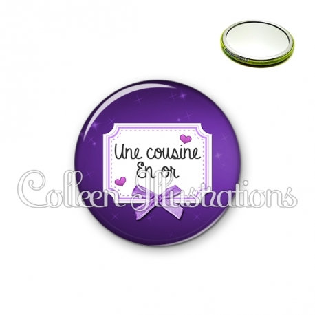 Image imprimée en haute résolution sur papier de qualité, protégée d'un film plastique, et sertie sur une coque métallique avec dos miroir. Une seule face, non grossissante.