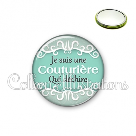 Image imprimée en haute résolution sur papier de qualité, protégée d'un film plastique, et sertie sur une coque métallique avec dos miroir. Une seule face, non grossissante.
