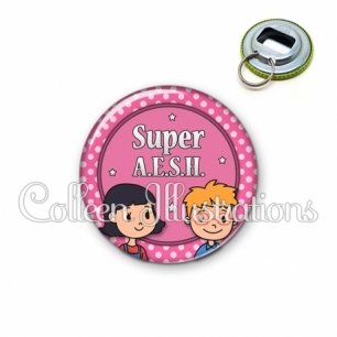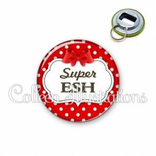 Décapsuleur métallique avec image fantaisie et texte.