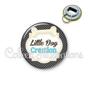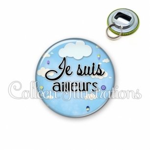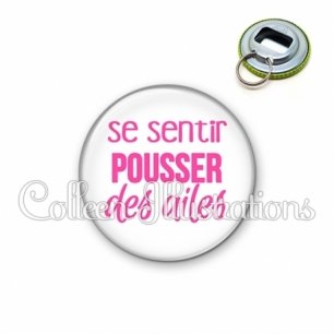 Décapsuleur métallique avec image fantaisie et texte.