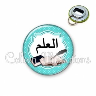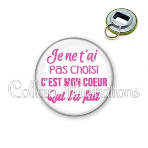 Décapsuleur métallique avec image fantaisie et texte.