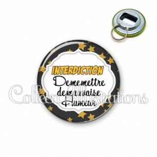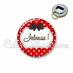Décapsuleur métallique avec image fantaisie et texte.