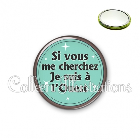 Image imprimée en haute résolution sur papier de qualité, protégée d'un film plastique, et sertie sur une coque métallique avec dos miroir. Une seule face, non grossissante.