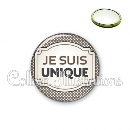 Image imprimée en haute résolution sur papier de qualité, protégée d'un film plastique, et sertie sur une coque métallique avec dos miroir. Une seule face, non grossissante.