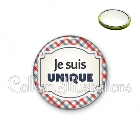 Image imprimée en haute résolution sur papier de qualité, protégée d'un film plastique, et sertie sur une coque métallique avec dos miroir. Une seule face, non grossissante.