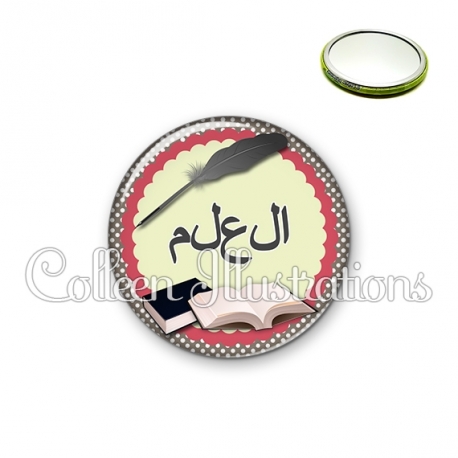 Image imprimée en haute résolution sur papier de qualité, protégée d'un film plastique, et sertie sur une coque métallique avec dos miroir. Une seule face, non grossissante.
