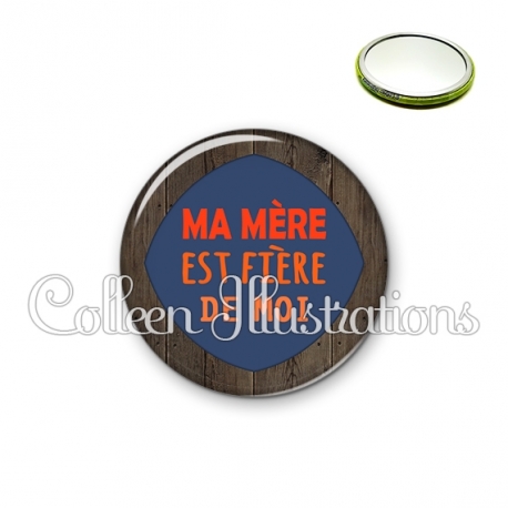 Image imprimée en haute résolution sur papier de qualité, protégée d'un film plastique, et sertie sur une coque métallique avec dos miroir. Une seule face, non grossissante.