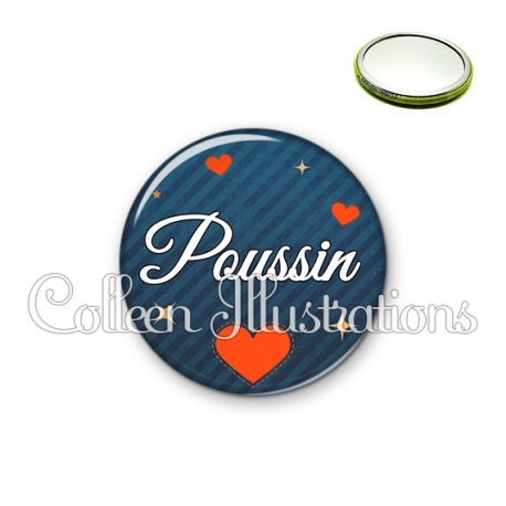 Image imprimée en haute résolution sur papier de qualité, protégée d'un film plastique, et sertie sur une coque métallique avec dos miroir. Une seule face, non grossissante.