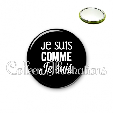 Image imprimée en haute résolution sur papier de qualité, protégée d'un film plastique, et sertie sur une coque métallique avec dos miroir. Une seule face, non grossissante.