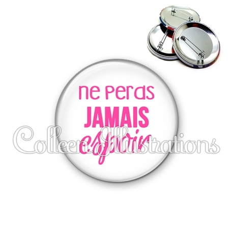 Image imprimée en haute résolution sur papier de qualité, protégée d'un film plastique, et sertie sur une coque et épingle métallique.