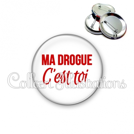 Image imprimée en haute résolution sur papier de qualité, protégée d'un film plastique, et sertie sur une coque et épingle métallique.