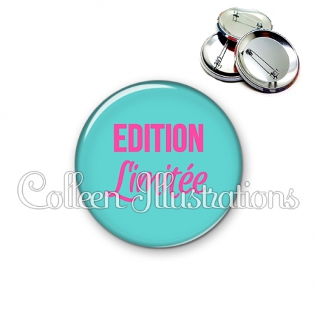 Image imprimée en haute résolution sur papier de qualité, protégée d'un film plastique, et sertie sur une coque et épingle métallique.