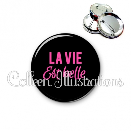 Image imprimée en haute résolution sur papier de qualité, protégée d'un film plastique, et sertie sur une coque et épingle métallique.