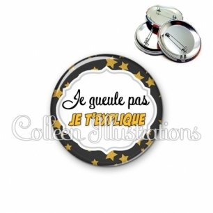 Badge métallique avec image fantaisie et texte.