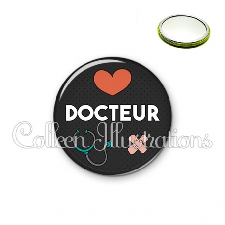 Image imprimée en haute résolution sur papier de qualité, protégée d'un film plastique, et sertie sur une coque métallique avec dos miroir. Une seule face, non grossissante.