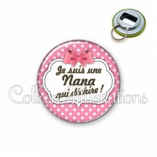 Décapsuleur métallique avec image fantaisie et texte.