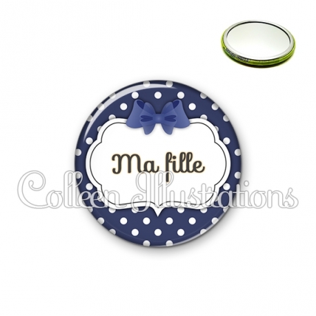 Image imprimée en haute résolution sur papier de qualité, protégée d'un film plastique, et sertie sur une coque métallique avec dos miroir. Une seule face, non grossissante.