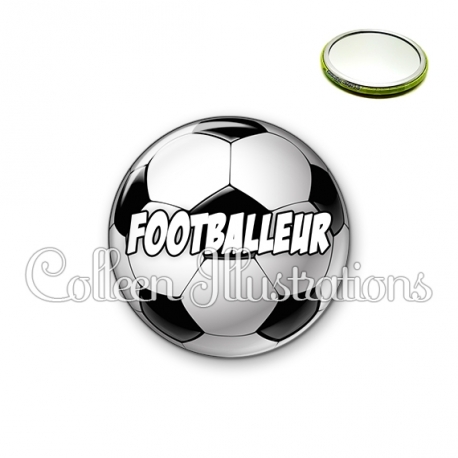Image imprimée en haute résolution sur papier de qualité, protégée d'un film plastique, et sertie sur une coque métallique avec dos miroir. Une seule face, non grossissante.