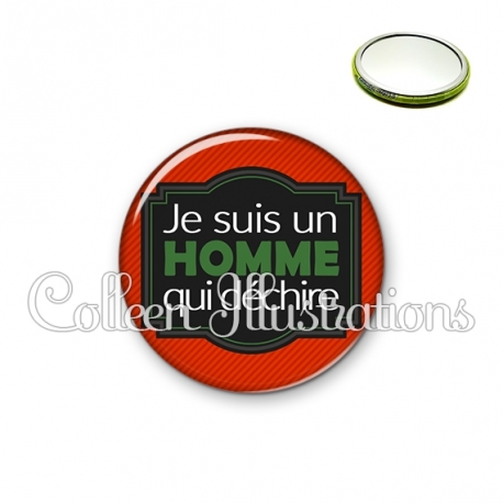 Image imprimée en haute résolution sur papier de qualité, protégée d'un film plastique, et sertie sur une coque métallique avec dos miroir. Une seule face, non grossissante.