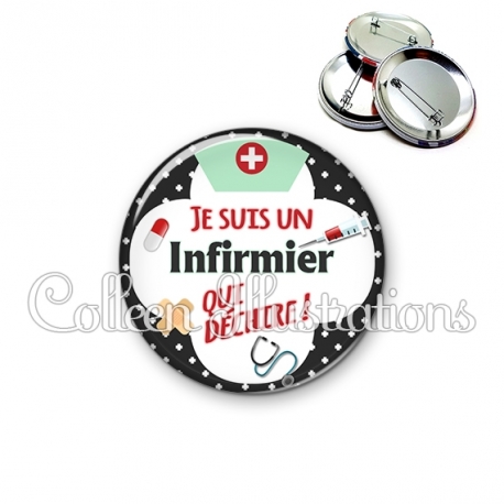 Image imprimée en haute résolution sur papier de qualité, protégée d'un film plastique, et sertie sur une coque et épingle métallique.