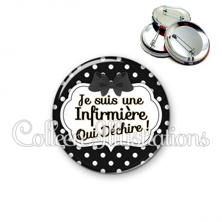 Image imprimée en haute résolution sur papier de qualité, protégée d'un film plastique, et sertie sur une coque et épingle métallique.