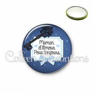 Image imprimée en haute résolution sur papier de qualité, protégée d'un film plastique, et sertie sur une coque métallique avec dos miroir. Une seule face, non grossissante.