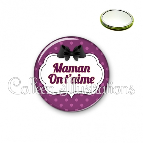 Image imprimée en haute résolution sur papier de qualité, protégée d'un film plastique, et sertie sur une coque métallique avec dos miroir. Une seule face, non grossissante.