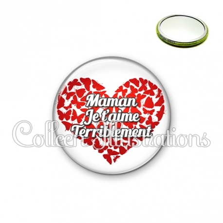 Image imprimée en haute résolution sur papier de qualité, protégée d'un film plastique, et sertie sur une coque métallique avec dos miroir. Une seule face, non grossissante.