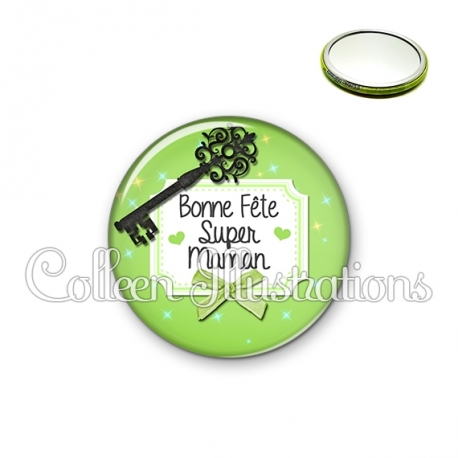 Miroir simple avec dos métallique décoré d'une image fantaisie et texte.