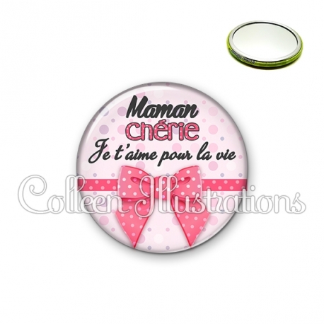 Image imprimée en haute résolution sur papier de qualité, protégée d'un film plastique, et sertie sur une coque métallique avec dos miroir. Une seule face, non grossissante.