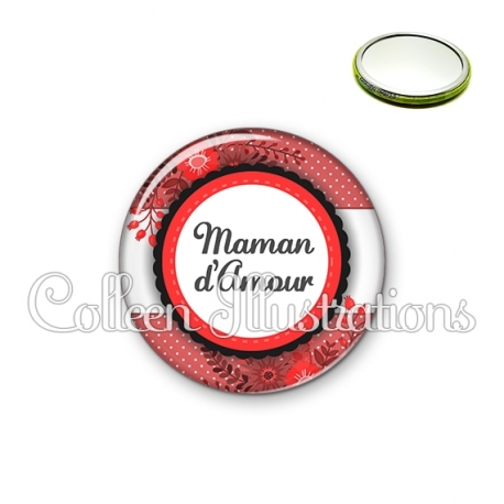 Image imprimée en haute résolution sur papier de qualité, protégée d'un film plastique, et sertie sur une coque métallique avec dos miroir. Une seule face, non grossissante.