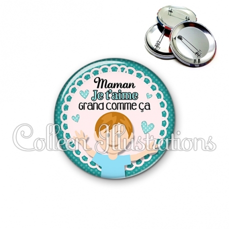 Image imprimée en haute résolution sur papier de qualité, protégée d'un film plastique, et sertie sur une coque et épingle métallique.