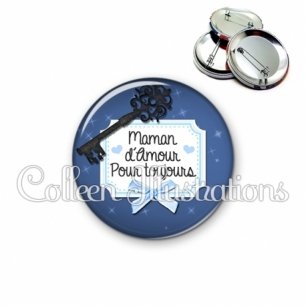 Image imprimée en haute résolution sur papier de qualité, protégée d'un film plastique, et sertie sur une coque et épingle métallique.